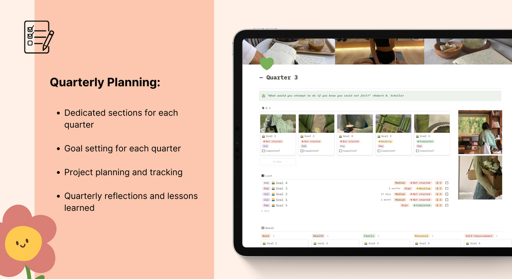 In this yearly planner, you can set your goals quarterly.