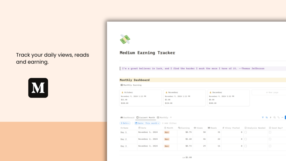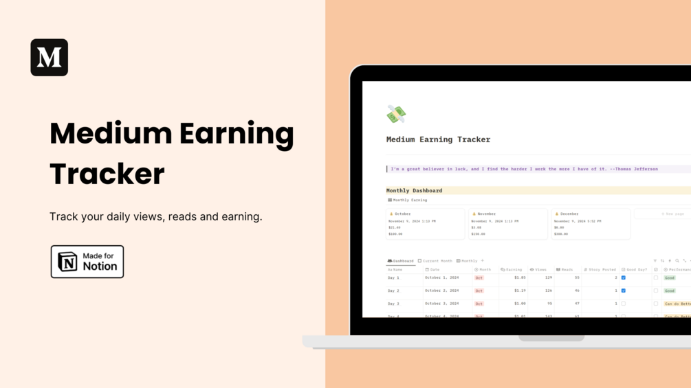 In this Notion template, you can track your daily Medium earnings. Also, you can track your monthly earnings with the monthly dashboard.