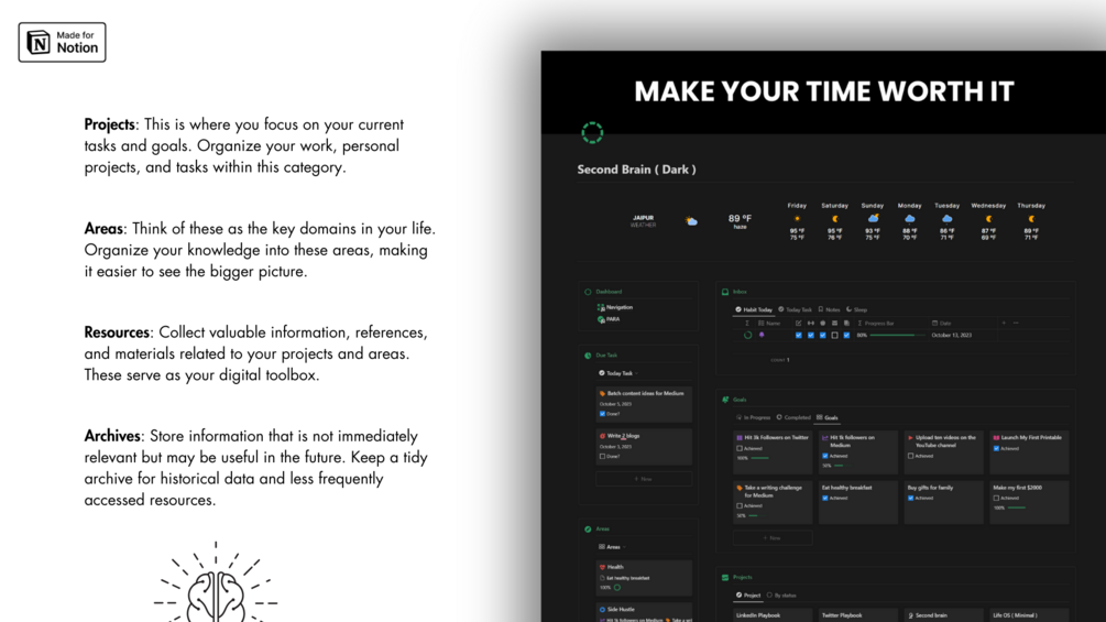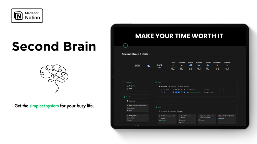 - Second Brain Notion Template: Transform your scattered thoughts into a structured system, enabling you to capture ideas, organize research, and unleash your creativity with ease.