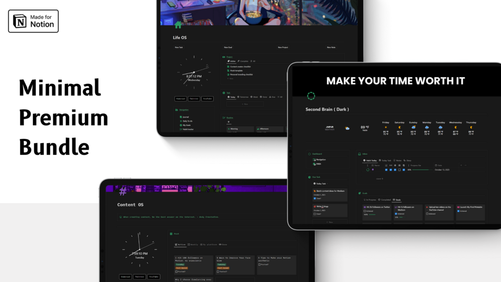Look no further than my Minimal Premium template Bundle, designed to streamline your digital life with three essential tools: Second Brain, Life OS, and Social Media Planner Notion templates.