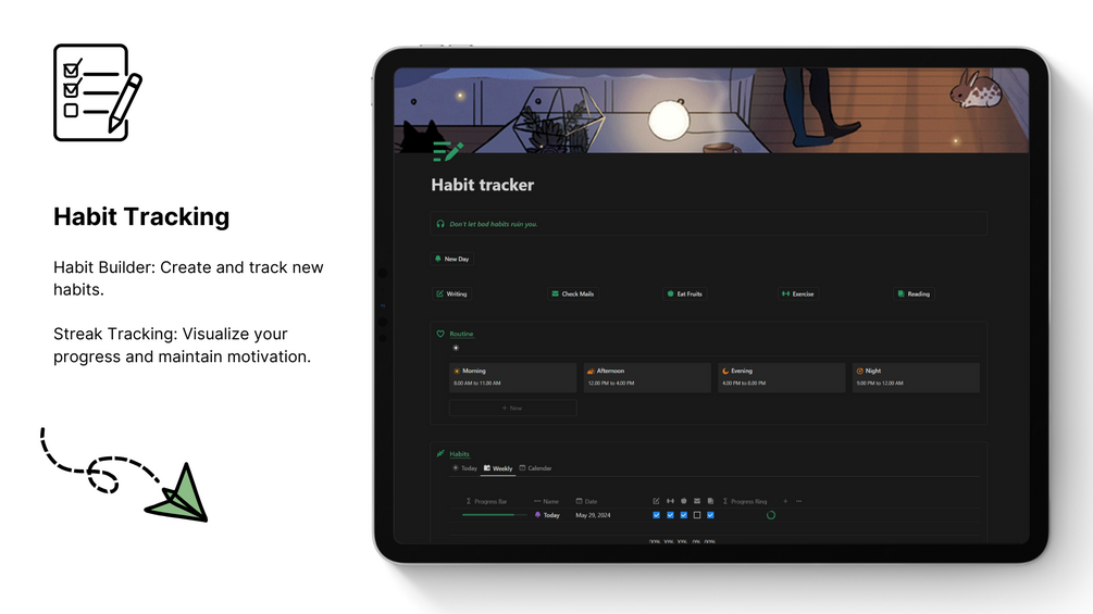 - Stay organized with a beautifully structured daily planner to manage tasks, track habits, and jot down notes.